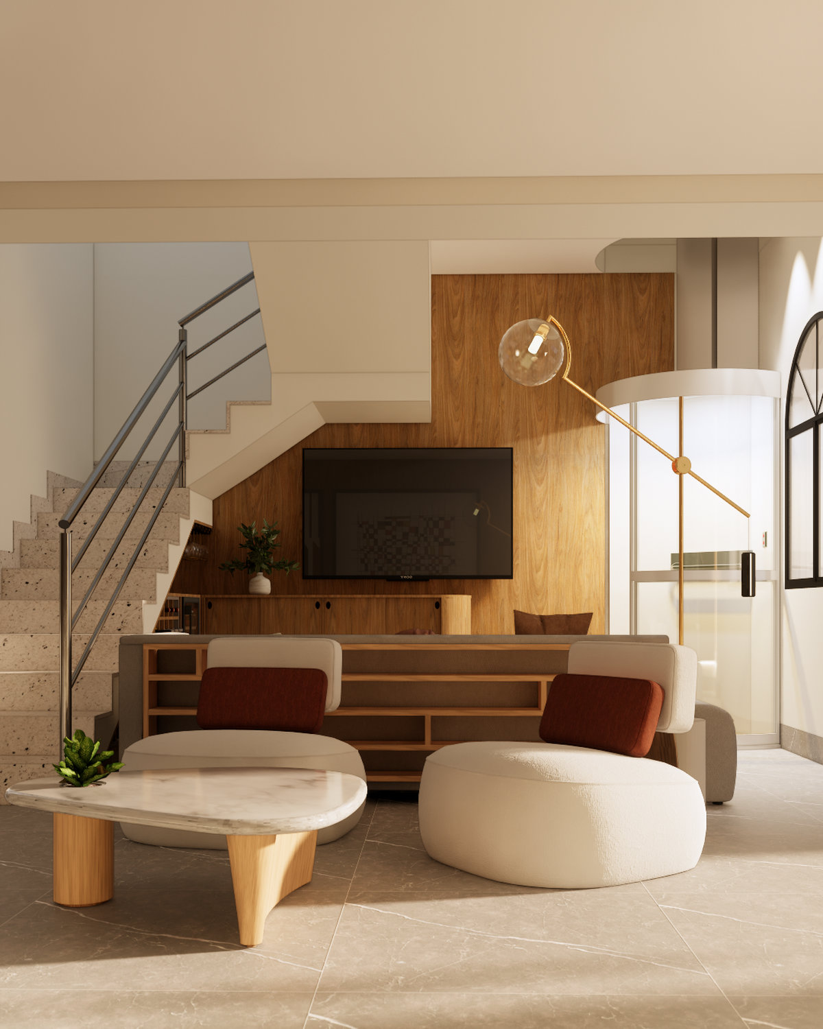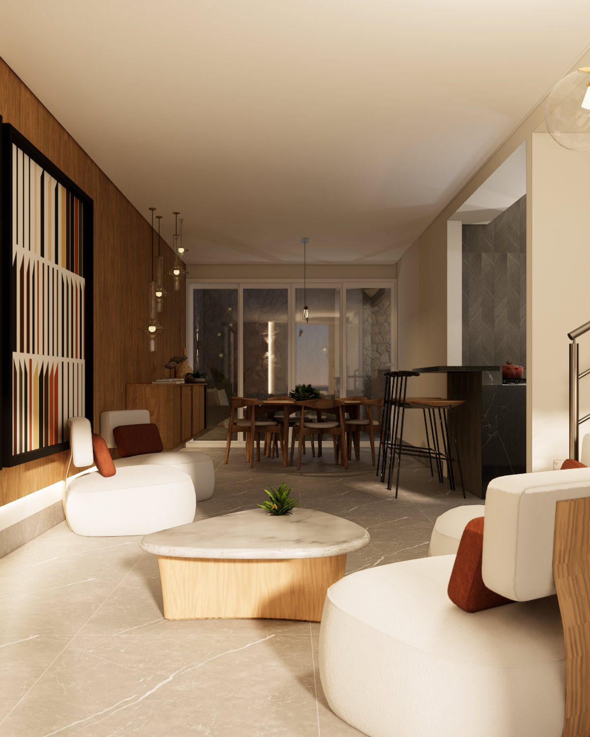 Em locais como a sala principal o layout foi pensado com atenção para que os usos pudessem ser tanto mesclados como separados. A adega abaixo da escada pode integrar a sala com a copa, ao mesmo tempo que consegue criar um ambiente mais íntimo e aconchegante para a sala de TV. Os painéis de madeira contribuem para o panorama dessa relação e criam harmonia e contraste quando comparados aos tons neutros utilizados, por exemplo, na cozinha. O elevador instalado nessa área, mostra a necessidade de adaptação, conforto e acessibilidade.