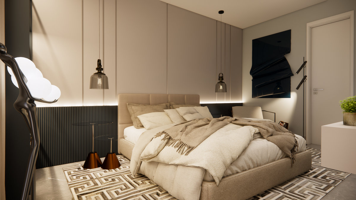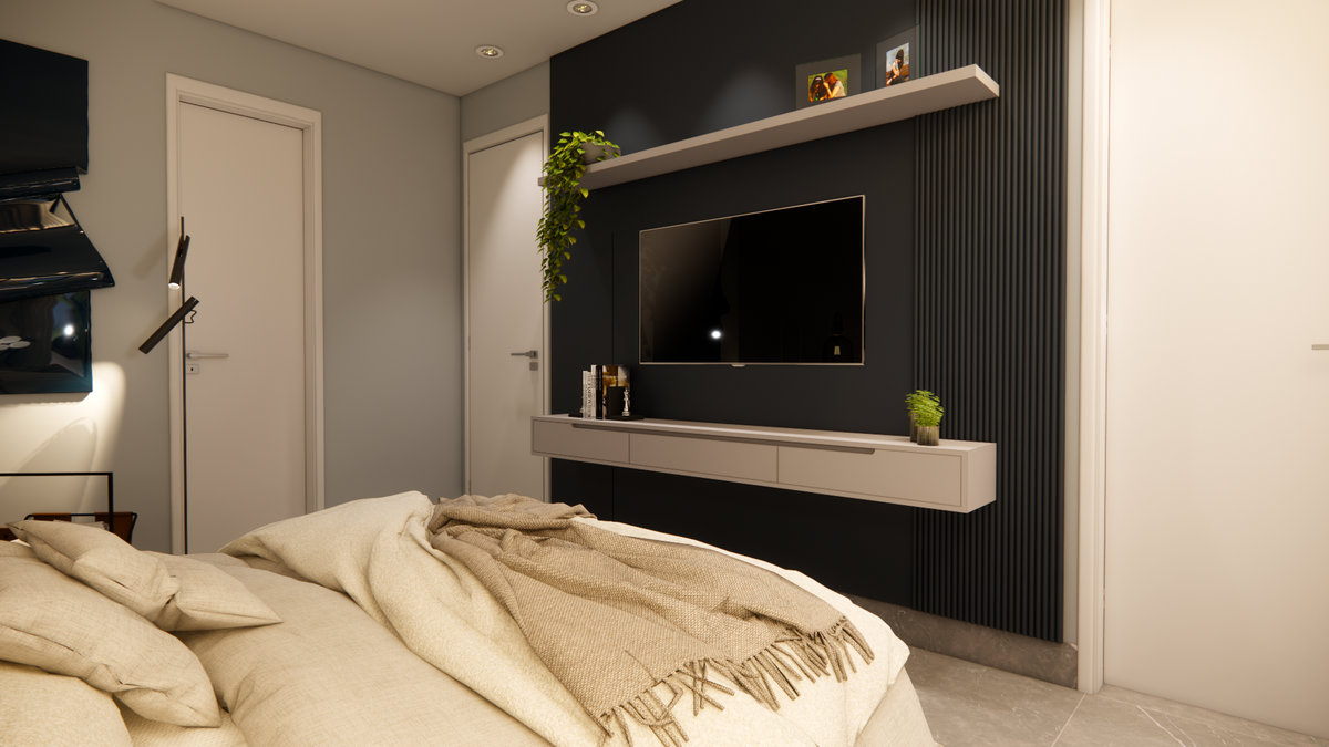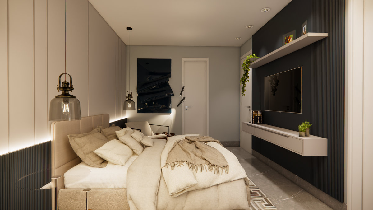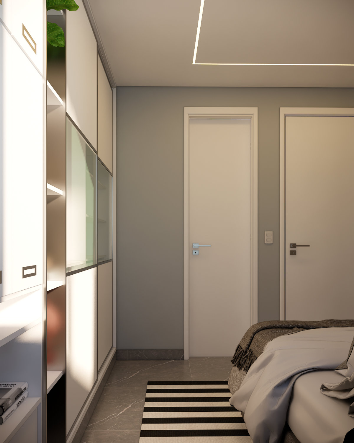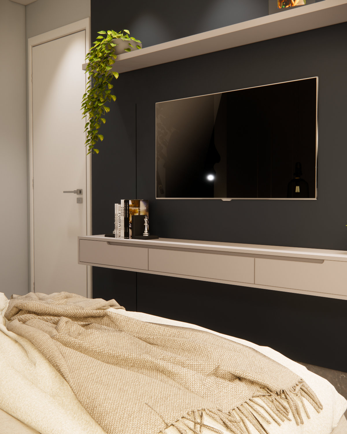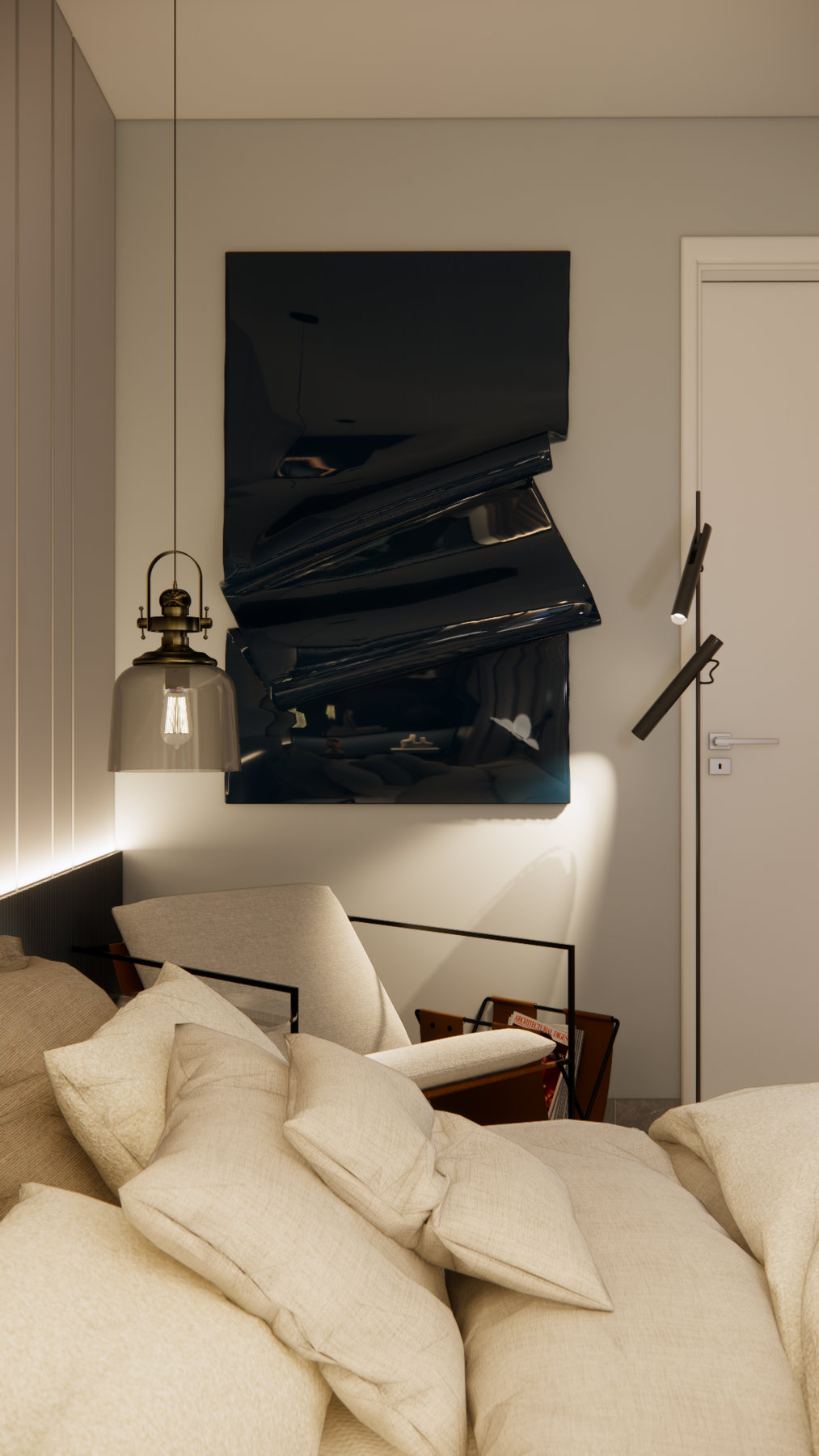 Já na Suite Master, tem-se um oásis pessoal. Apesar de um ambiente majoritariamente masculino, o azul ultramarino junto a tons neutros e os pontos de iluminação indireta, trazem serenidade remetendo intrinsicamente a descanso e espaço pessoal.