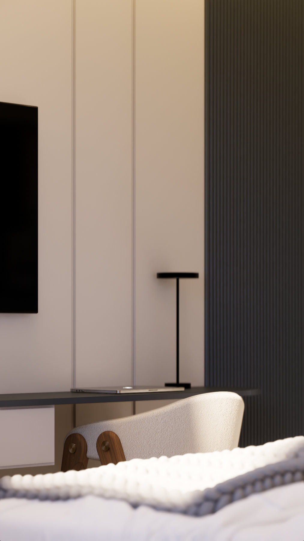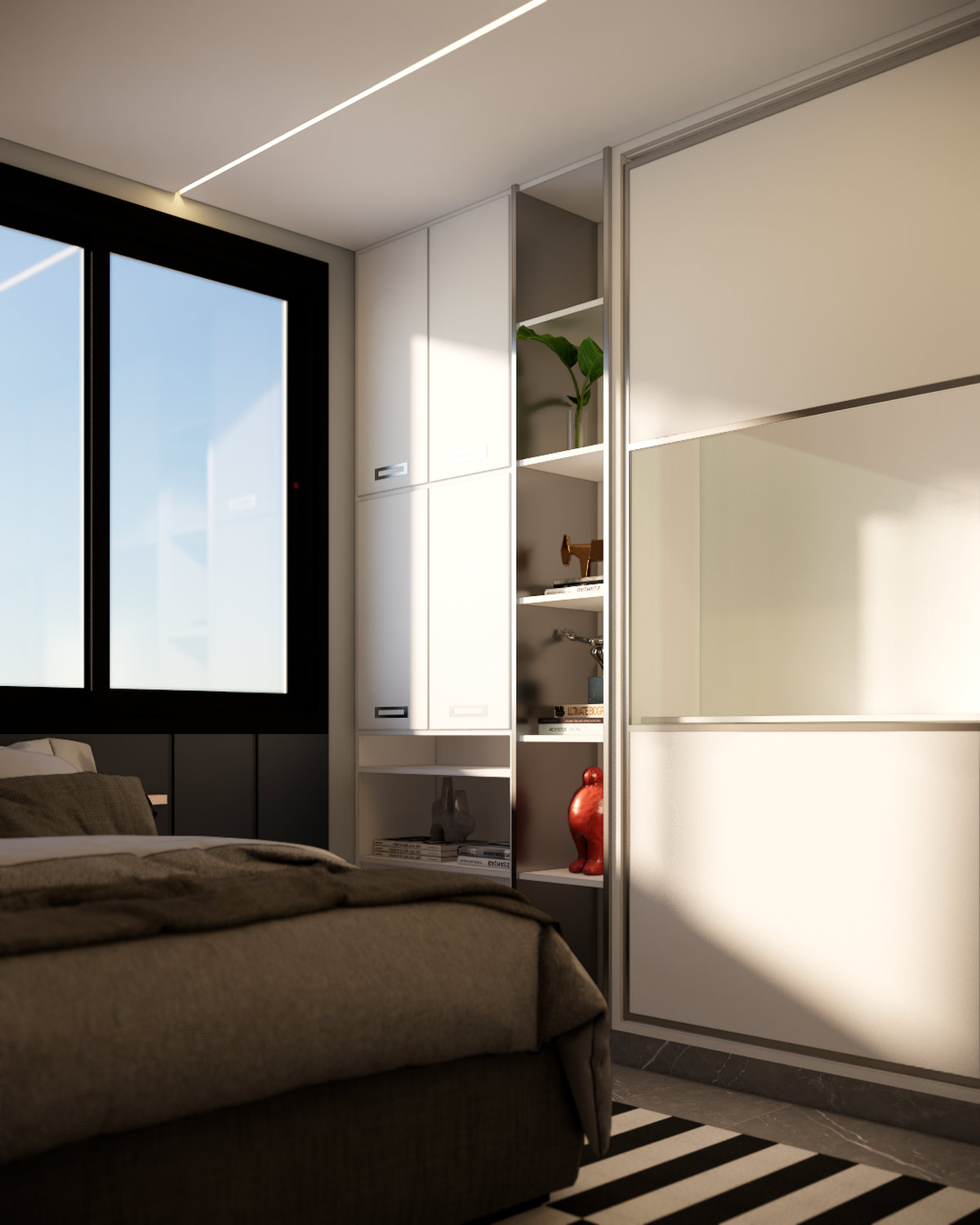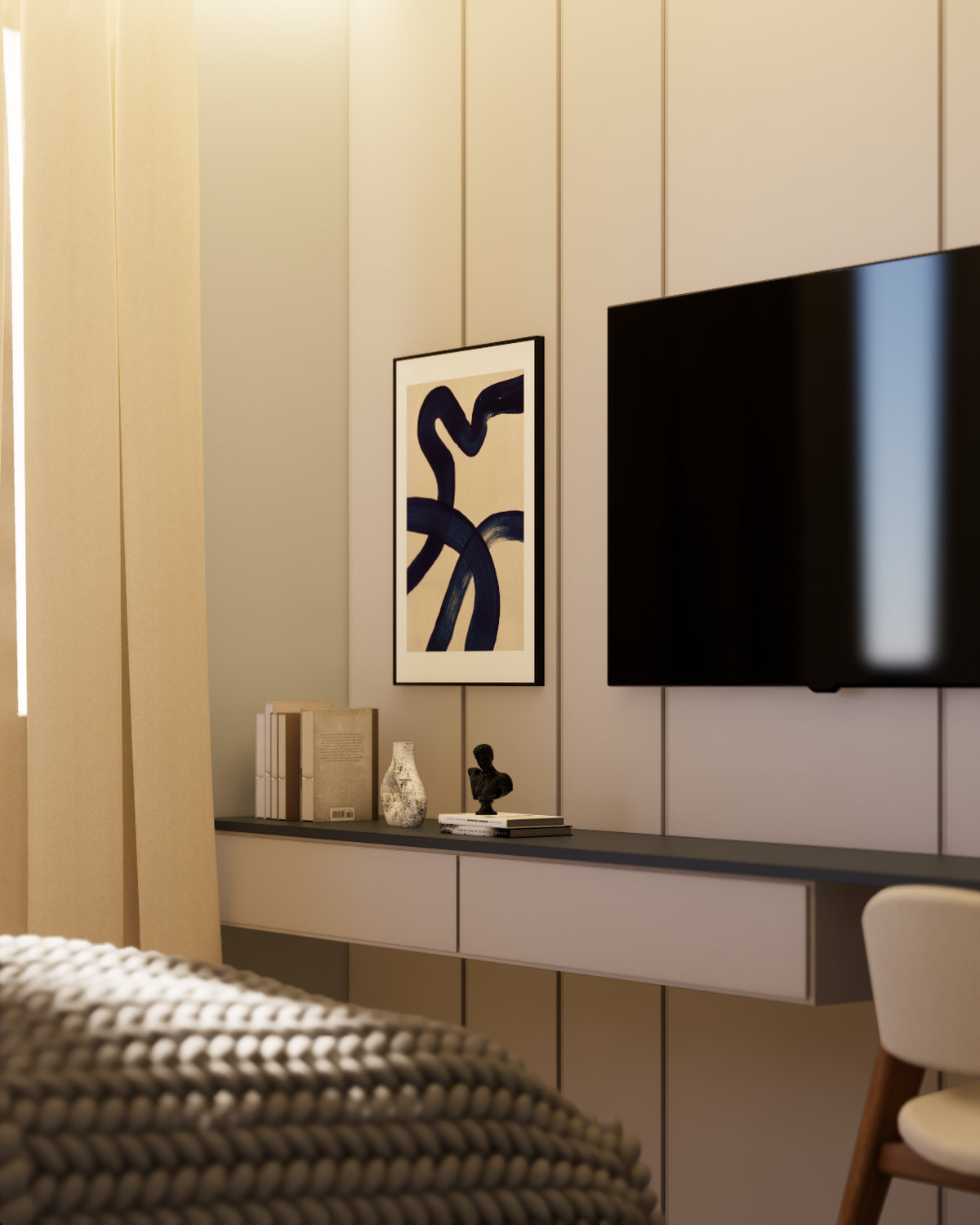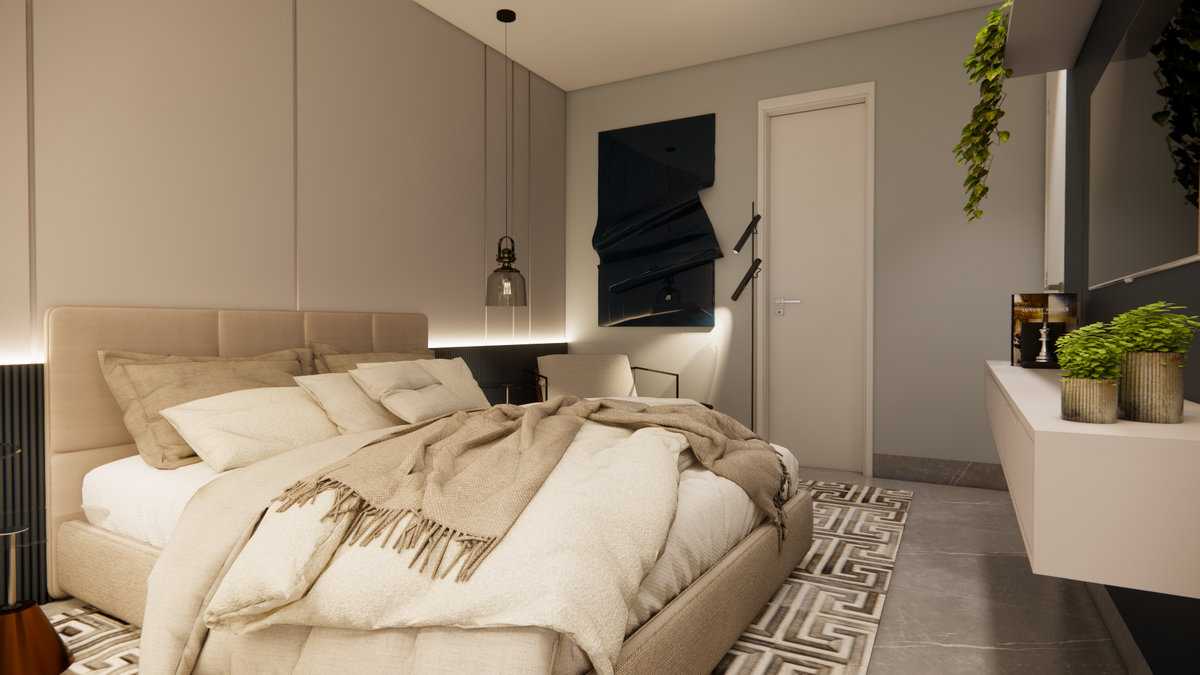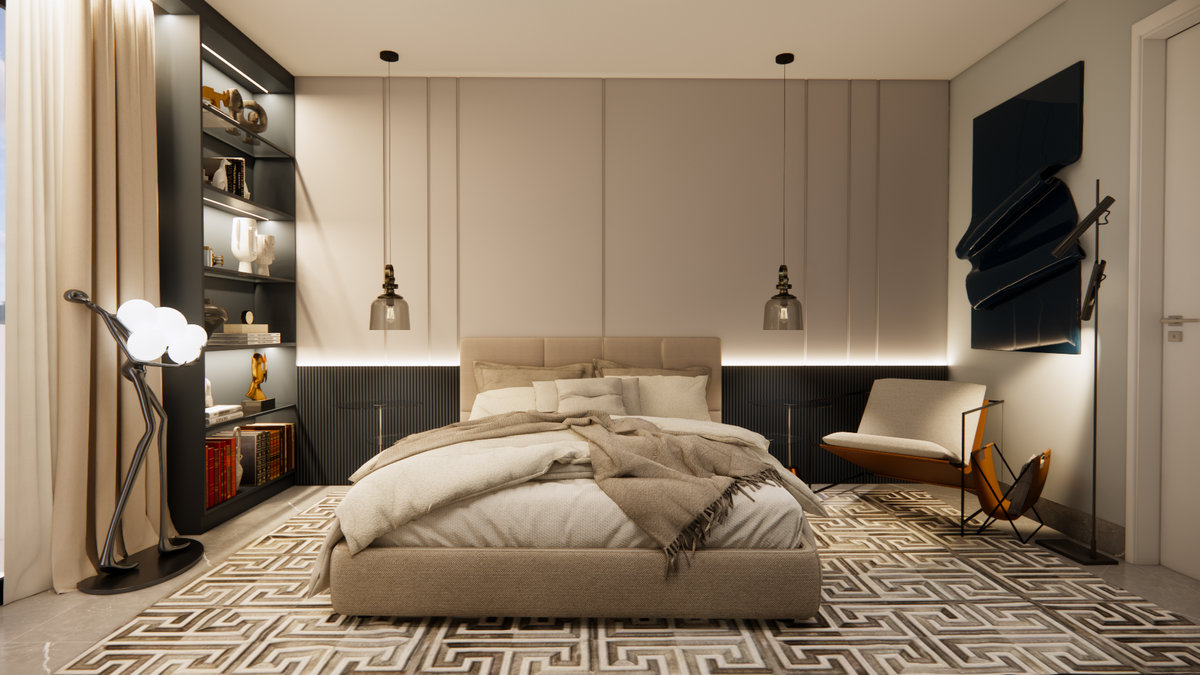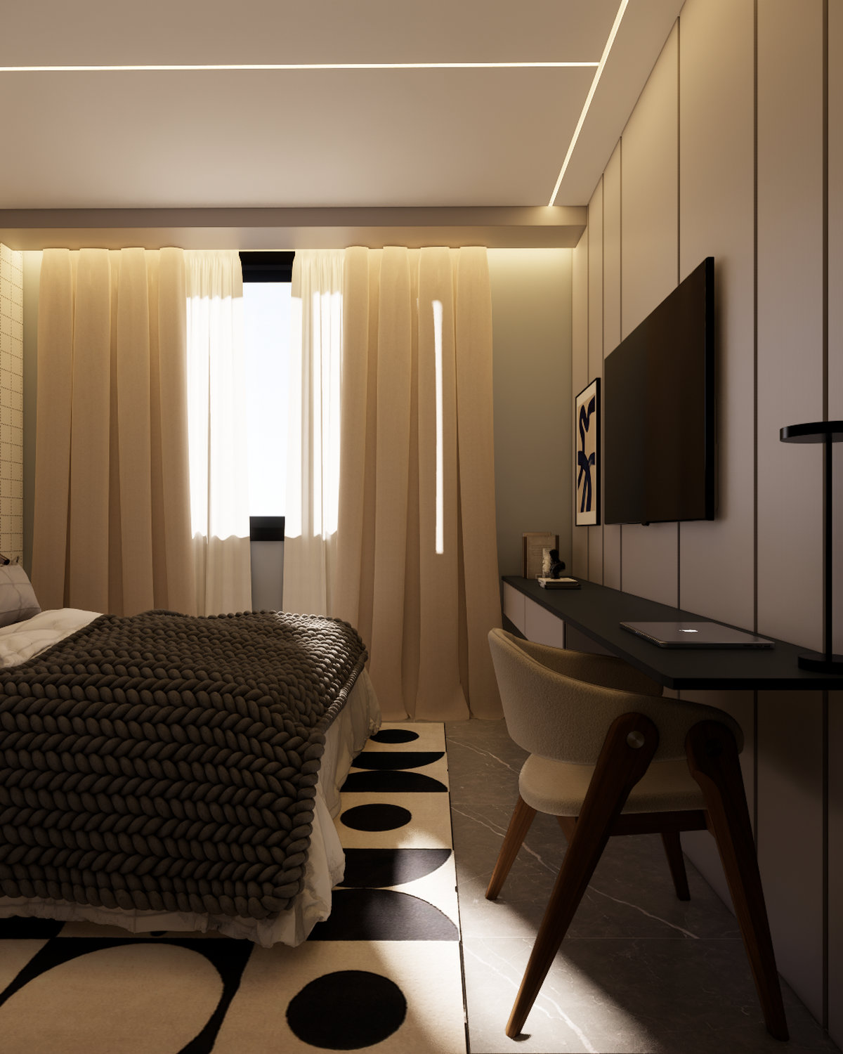 Já na Suite Master, tem-se um oásis pessoal. Apesar de um ambiente majoritariamente masculino, o azul ultramarino junto a tons neutros e os pontos de iluminação indireta, trazem serenidade remetendo intrinsicamente a descanso e espaço pessoal.