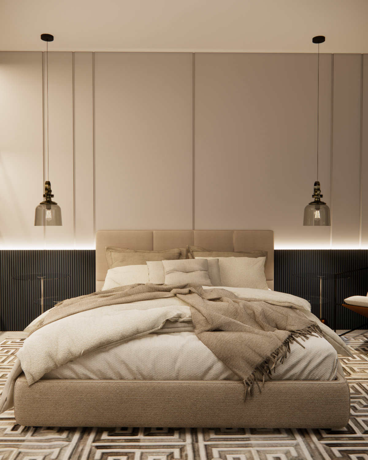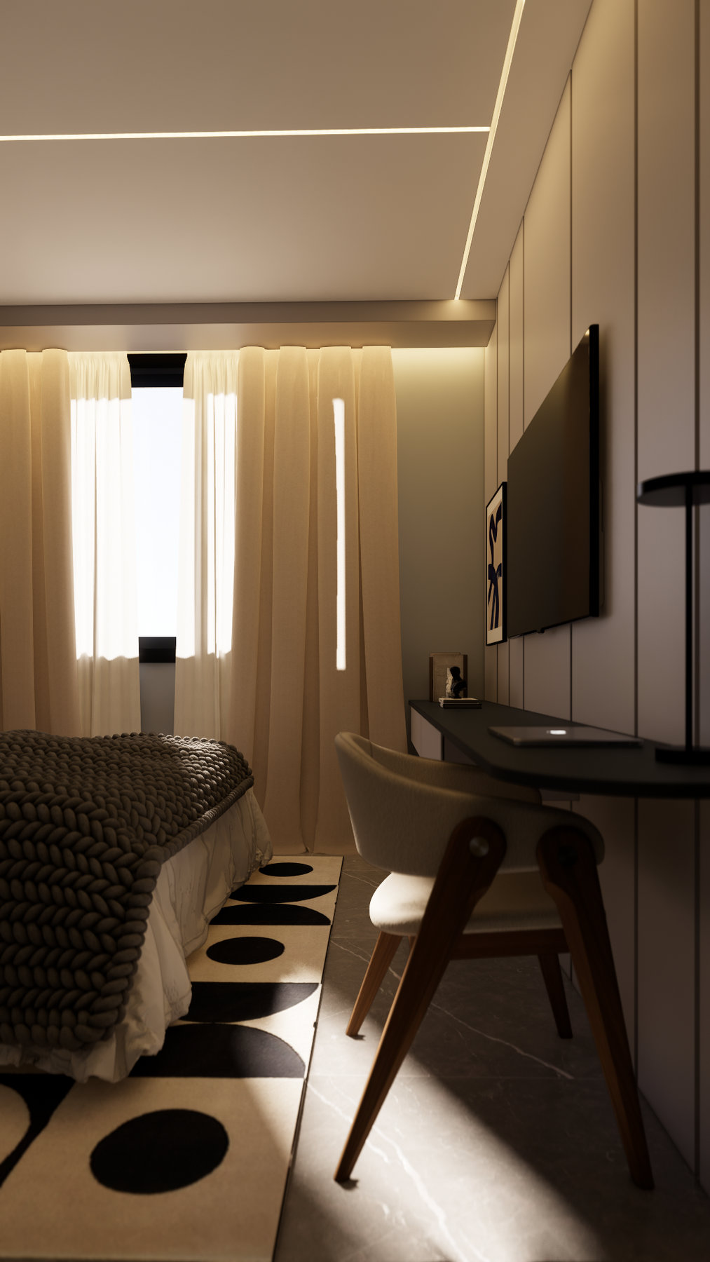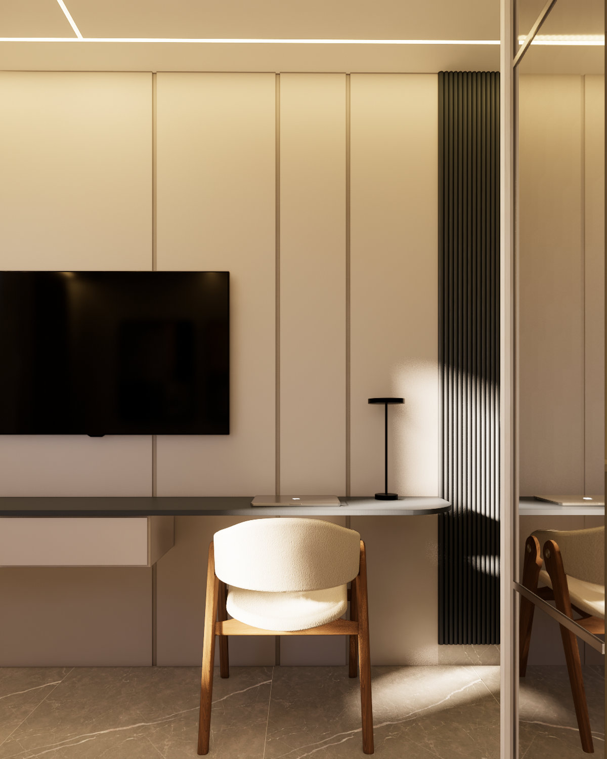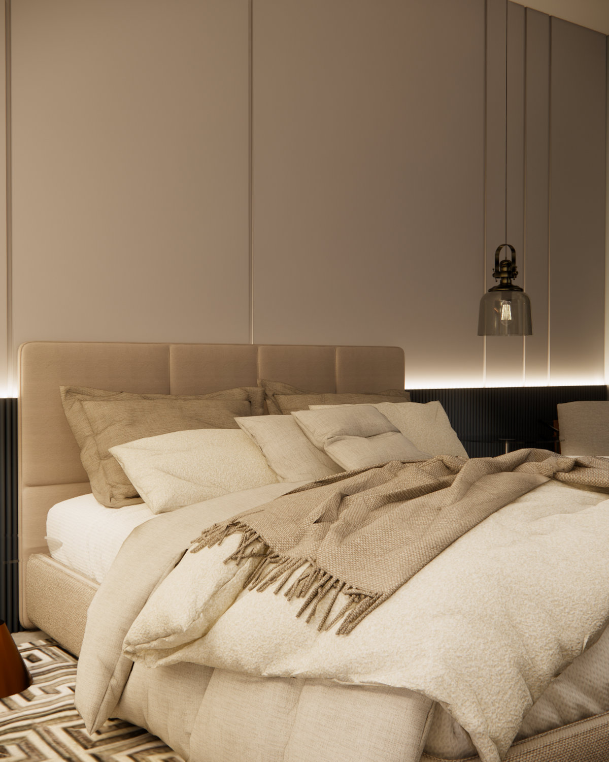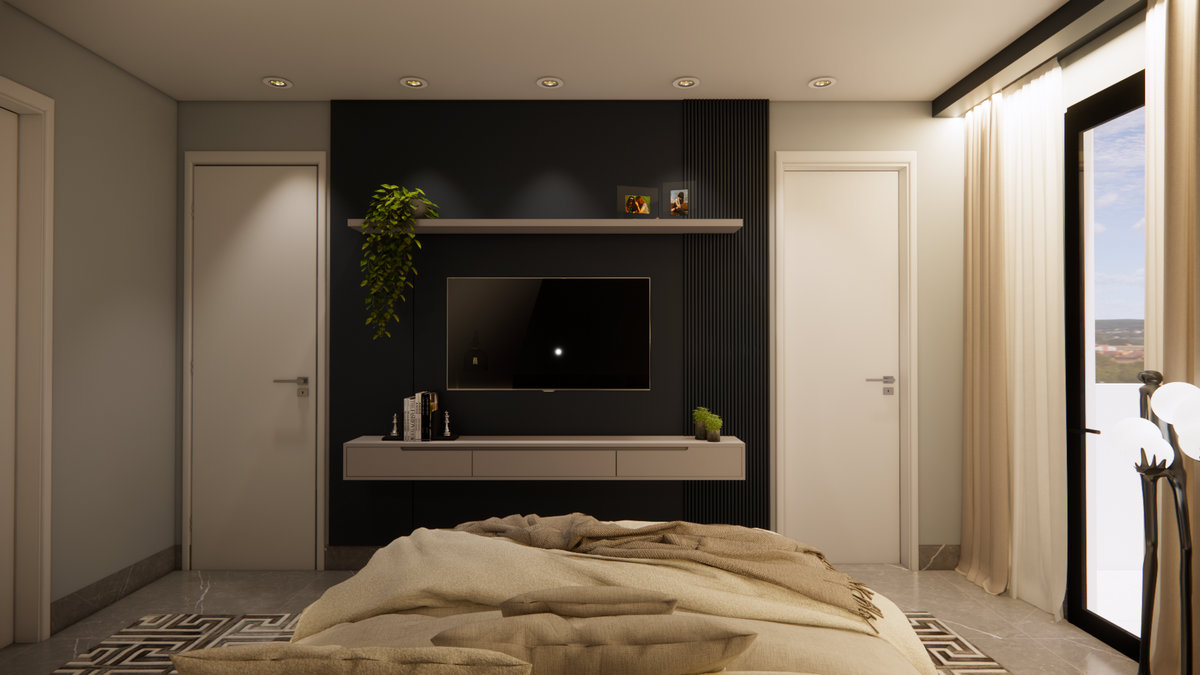 Já na Suite Master, tem-se um oásis pessoal. Apesar de um ambiente majoritariamente masculino, o azul ultramarino junto a tons neutros e os pontos de iluminação indireta, trazem serenidade remetendo intrinsicamente a descanso e espaço pessoal.