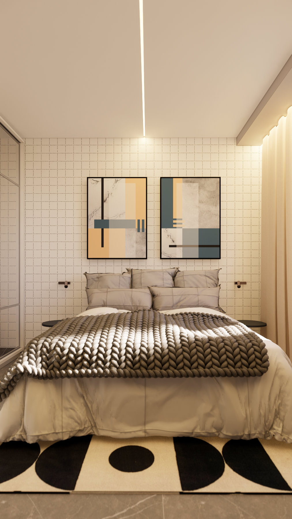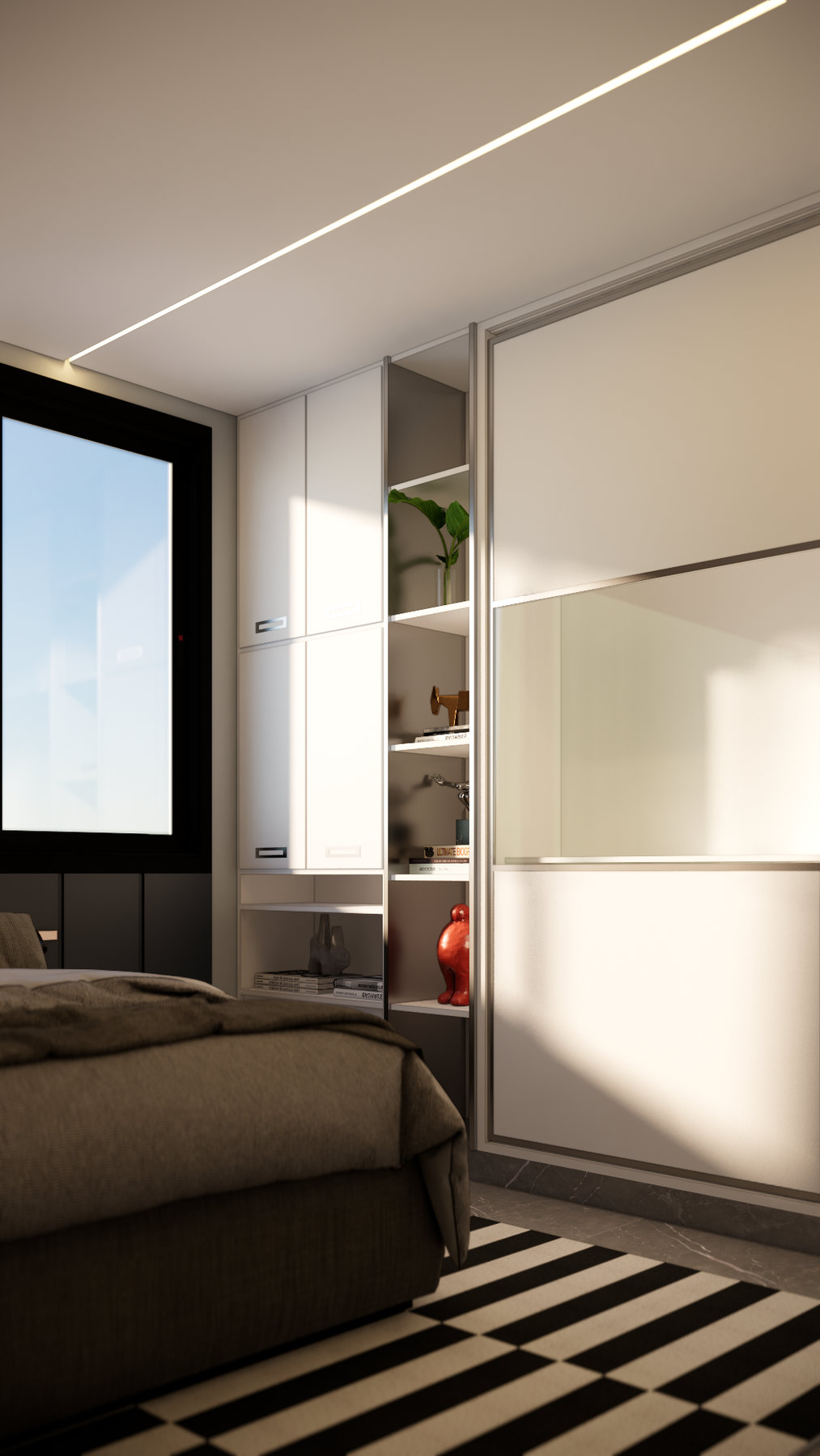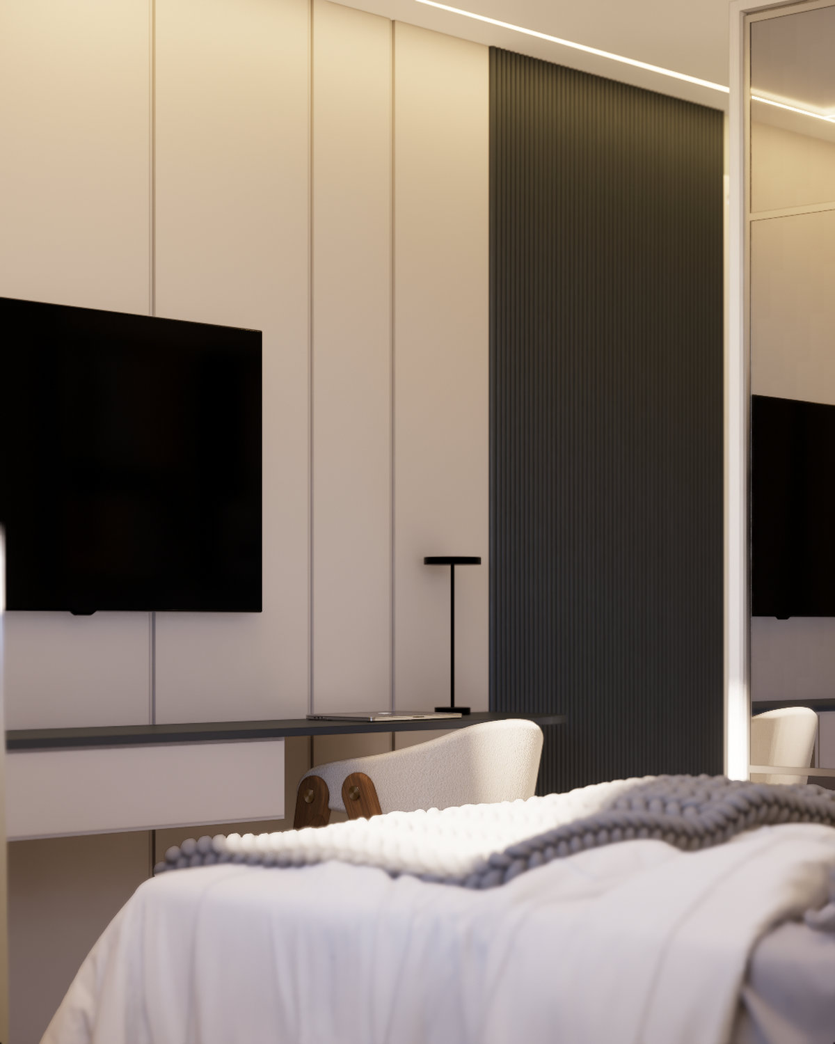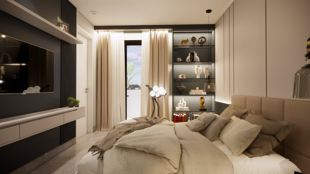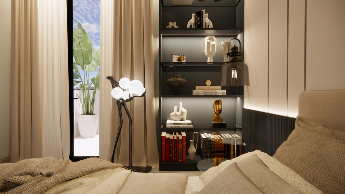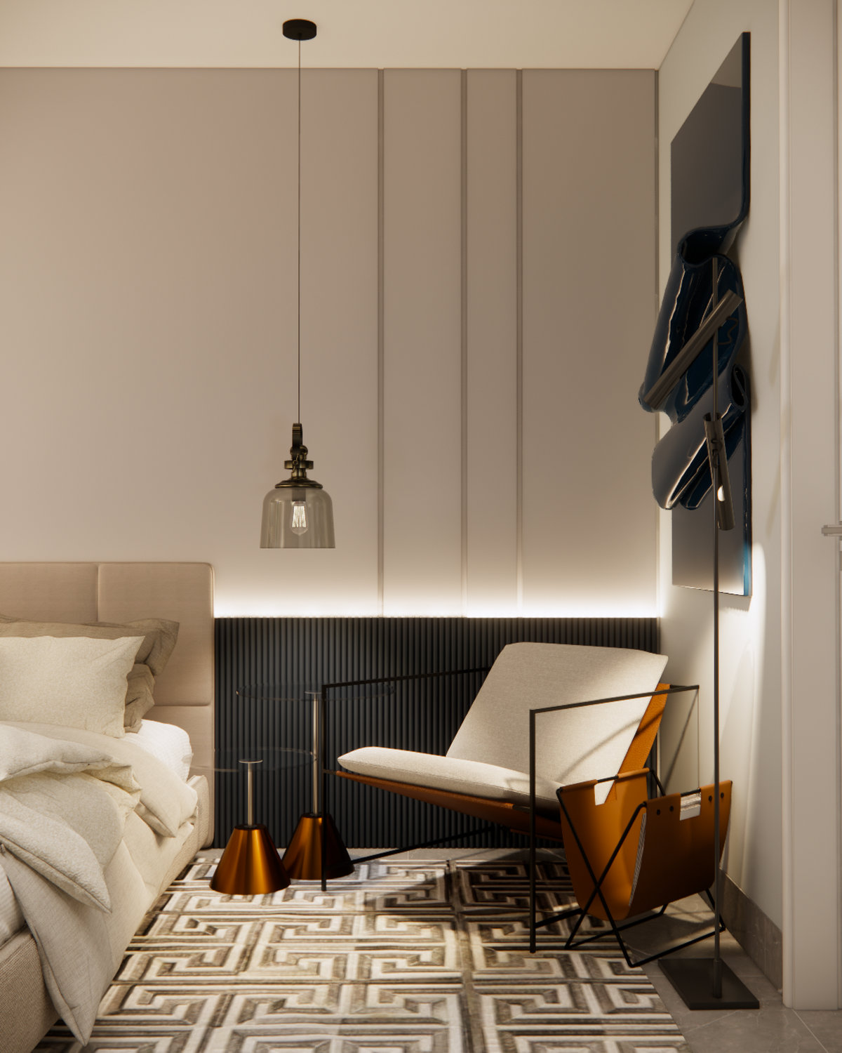 Já na Suite Master, tem-se um oásis pessoal. Apesar de um ambiente majoritariamente masculino, o azul ultramarino junto a tons neutros e os pontos de iluminação indireta, trazem serenidade remetendo intrinsicamente a descanso e espaço pessoal.