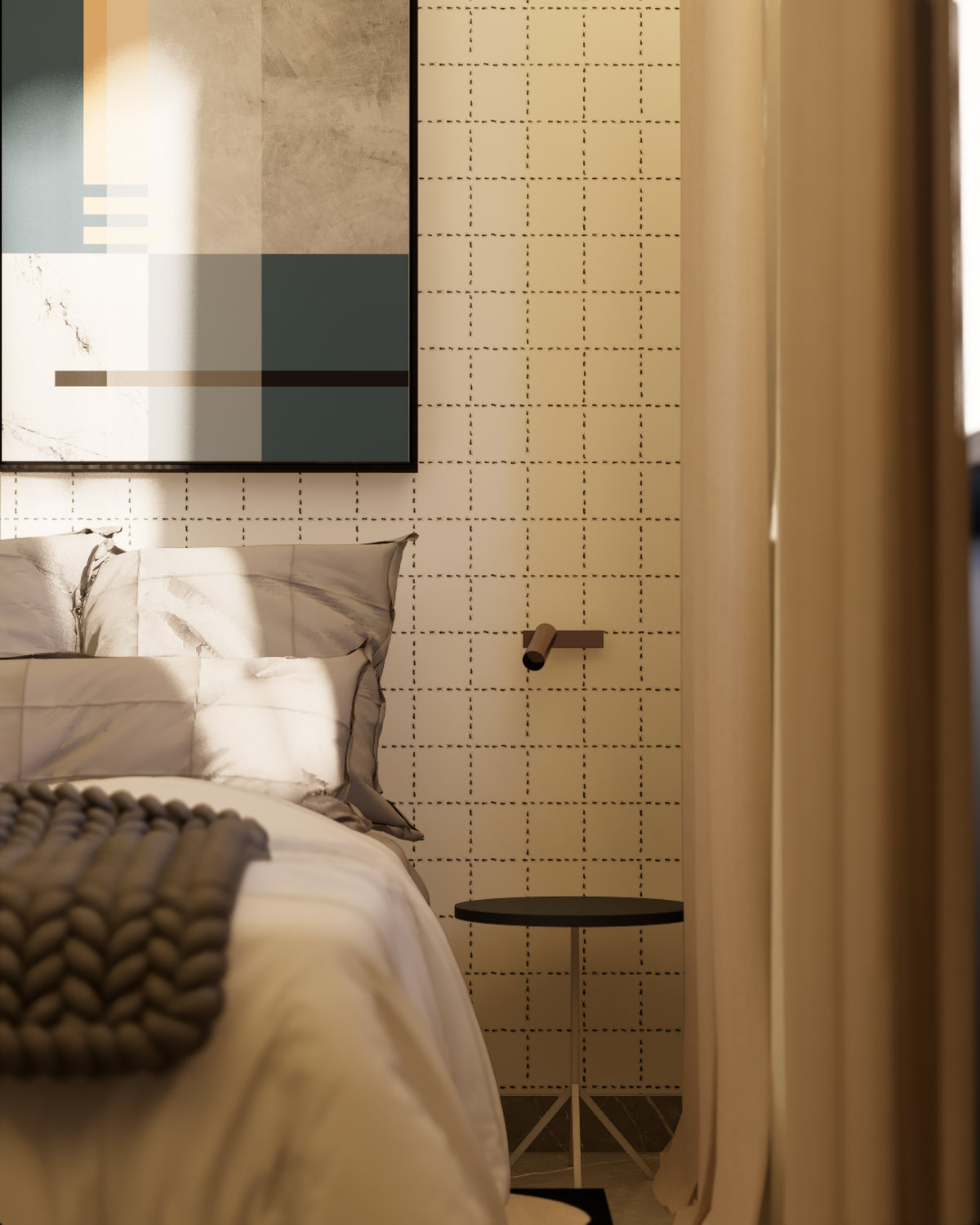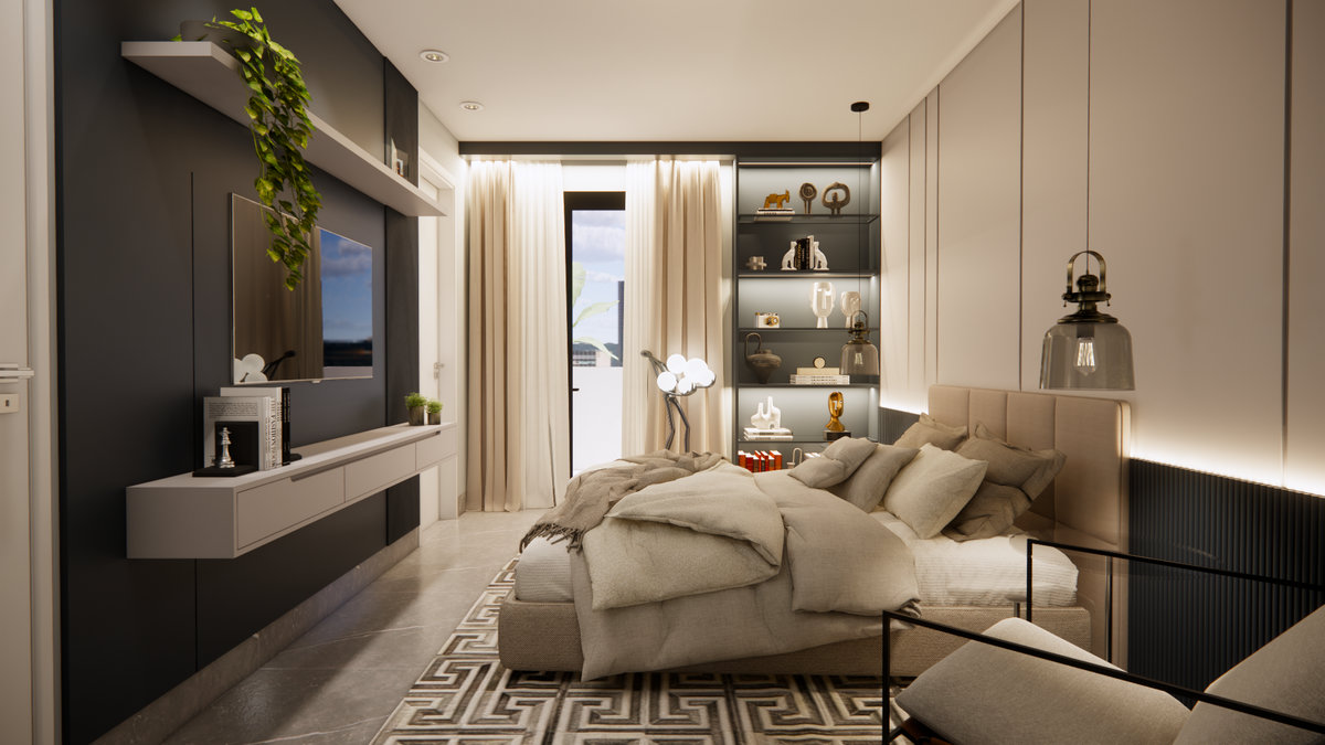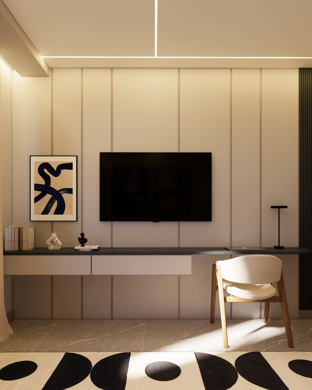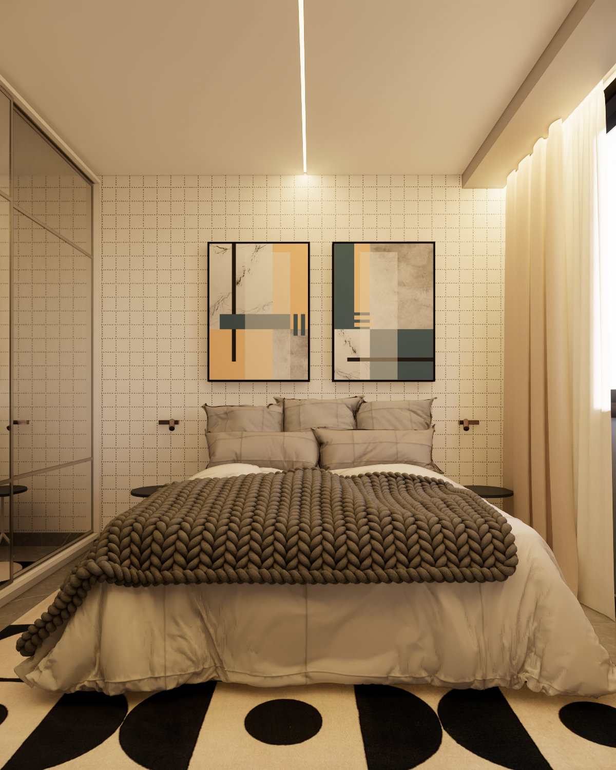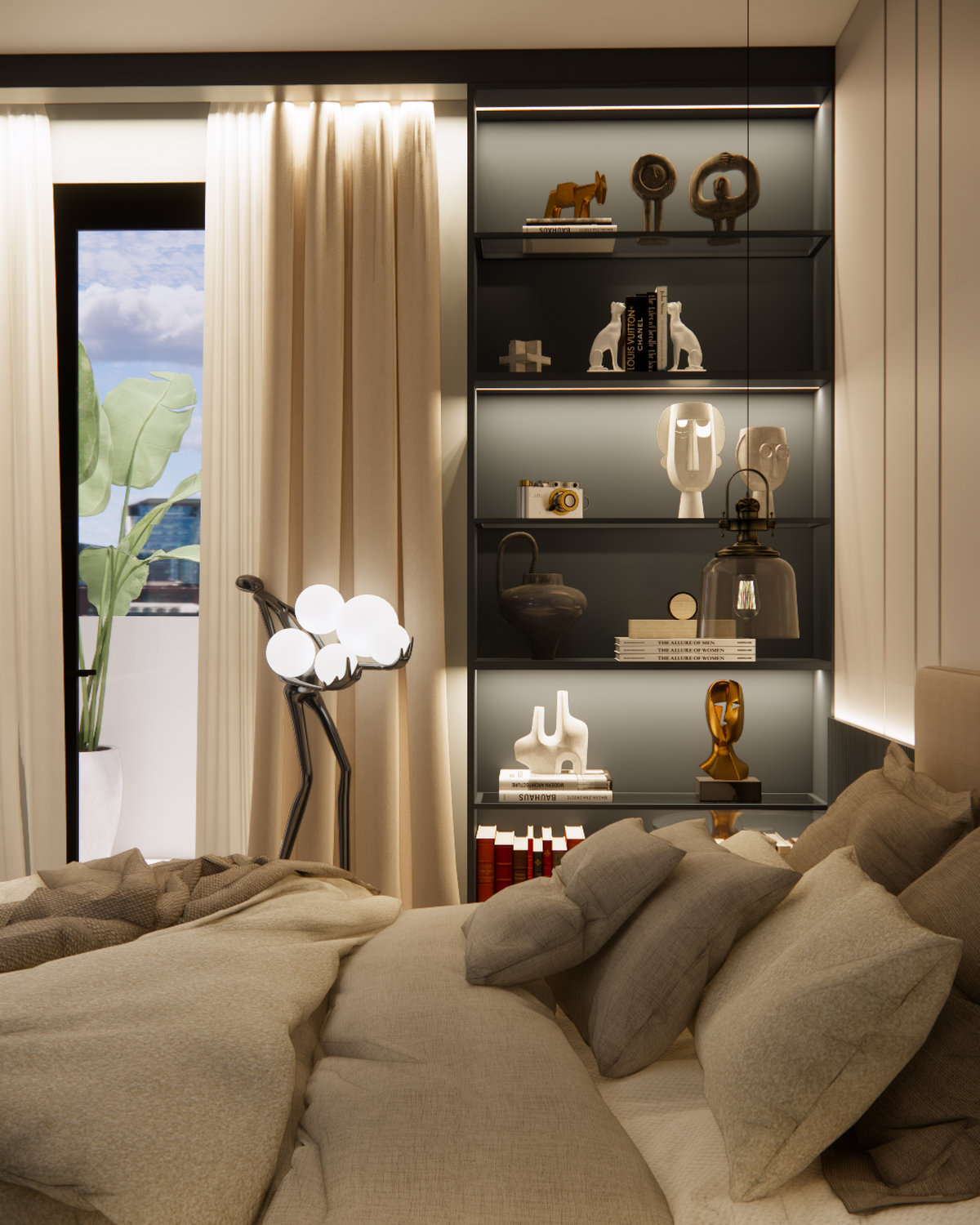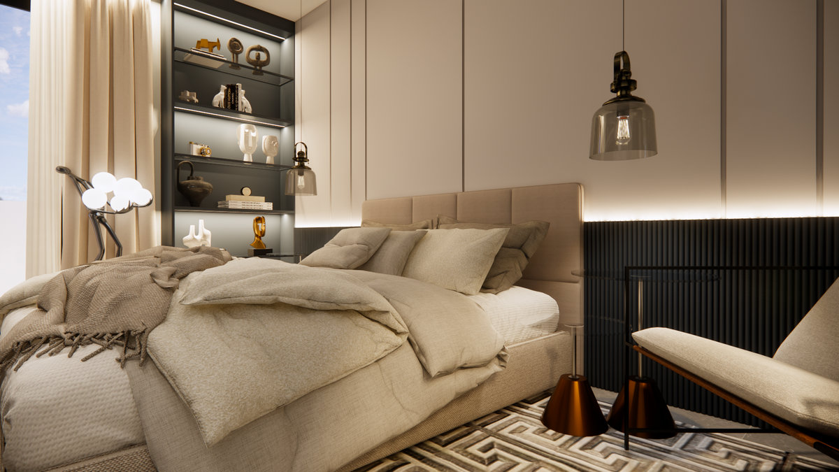 Já na Suite Master, tem-se um oásis pessoal. Apesar de um ambiente majoritariamente masculino, o azul ultramarino junto a tons neutros e os pontos de iluminação indireta, trazem serenidade remetendo intrinsicamente a descanso e espaço pessoal.