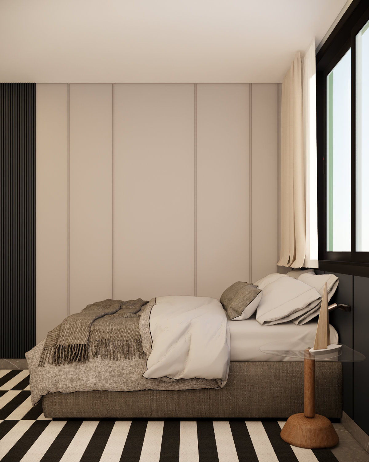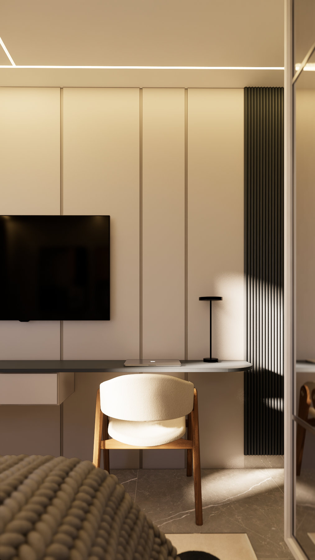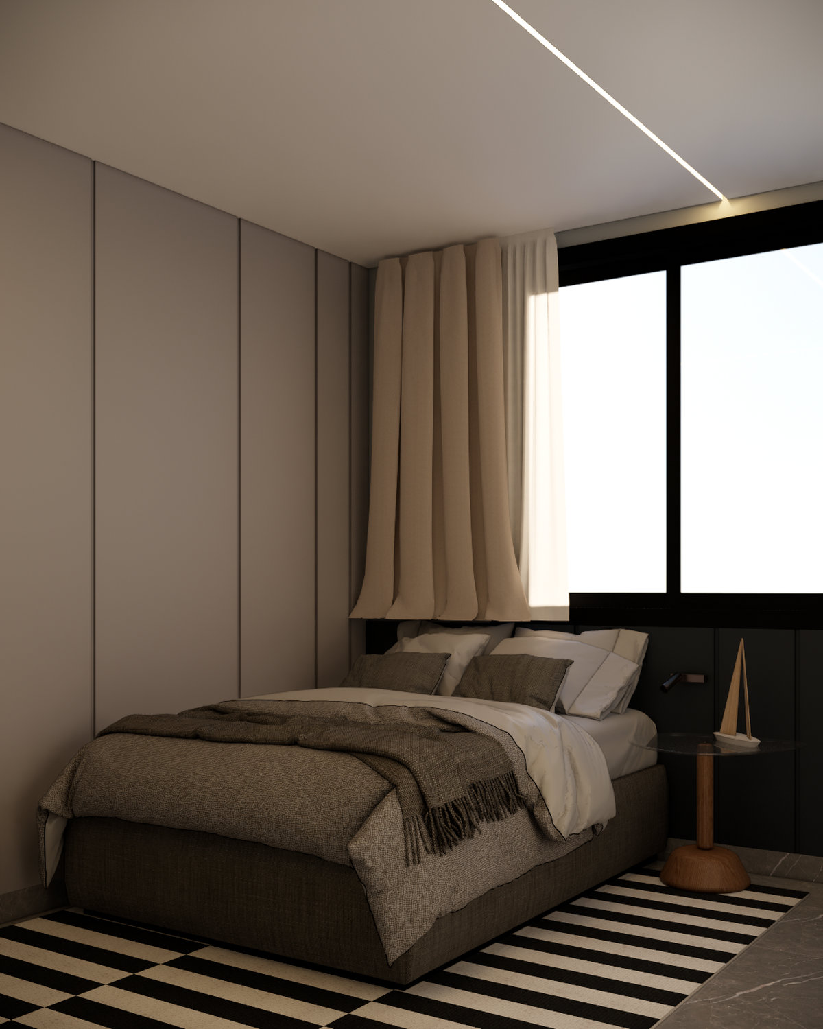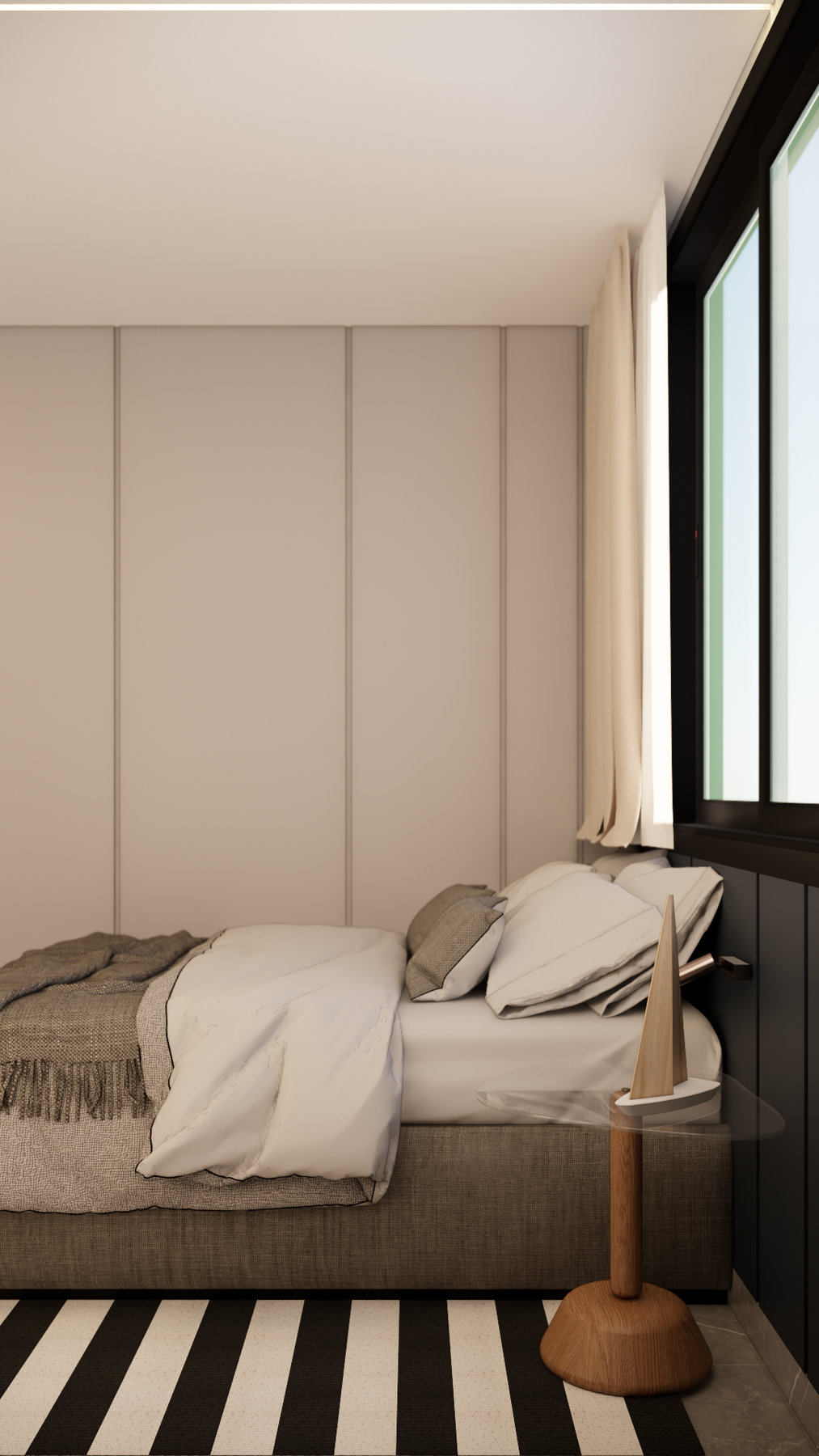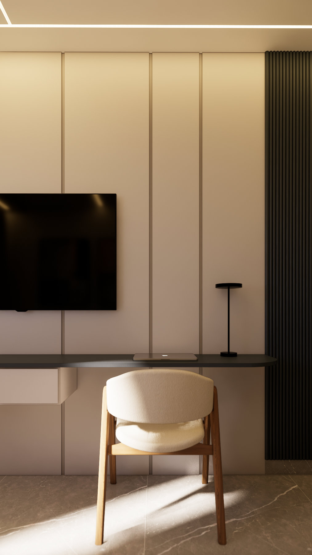 Já na Suite Master, tem-se um oásis pessoal. Apesar de um ambiente majoritariamente masculino, o azul ultramarino junto a tons neutros e os pontos de iluminação indireta, trazem serenidade remetendo intrinsicamente a descanso e espaço pessoal.