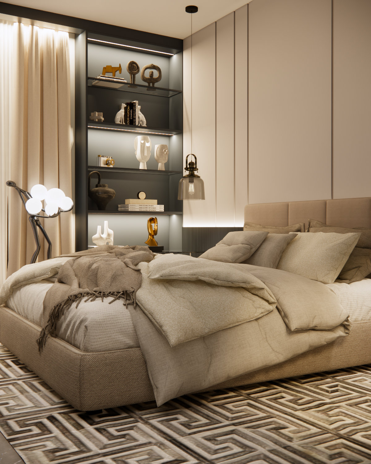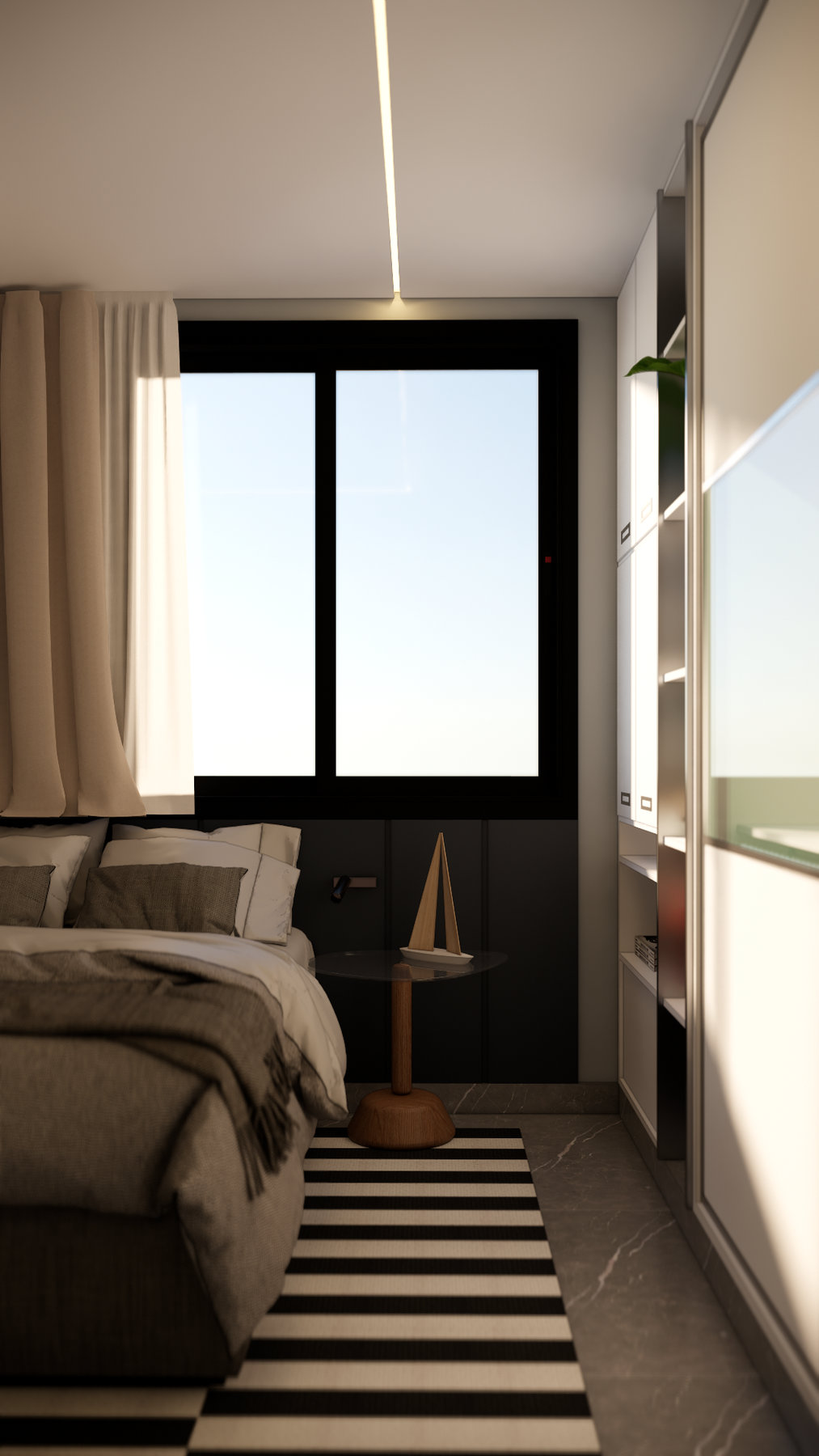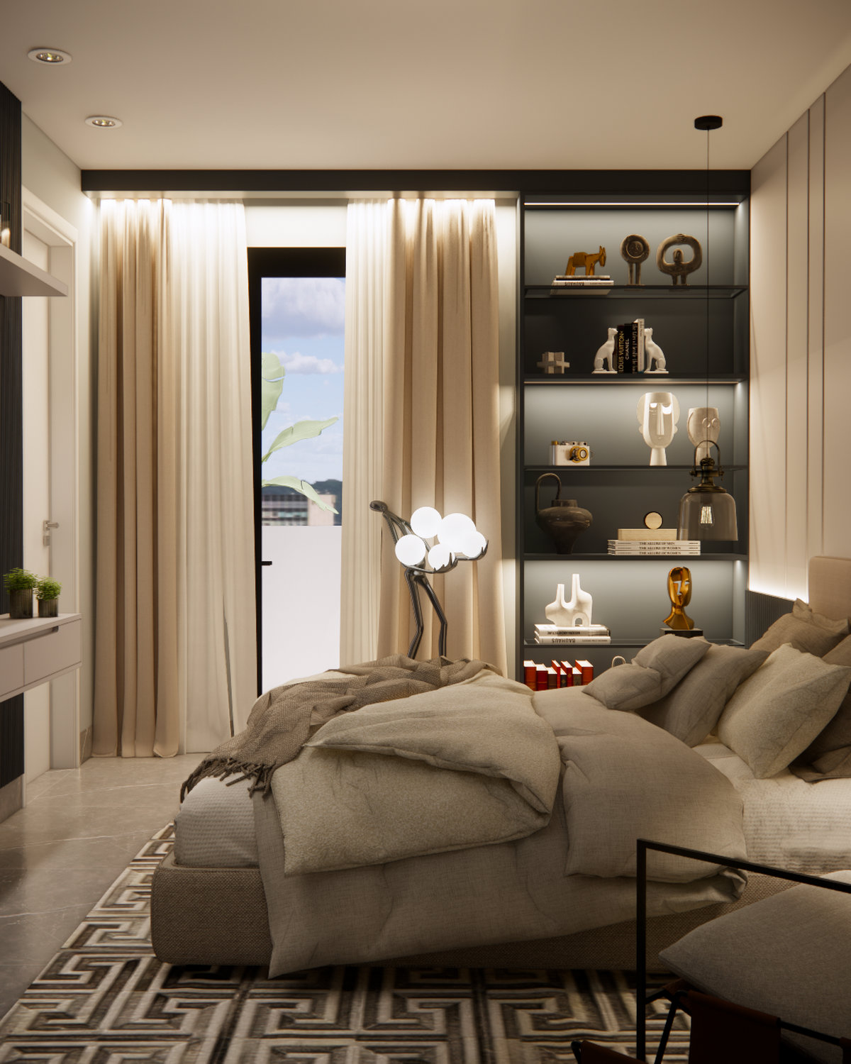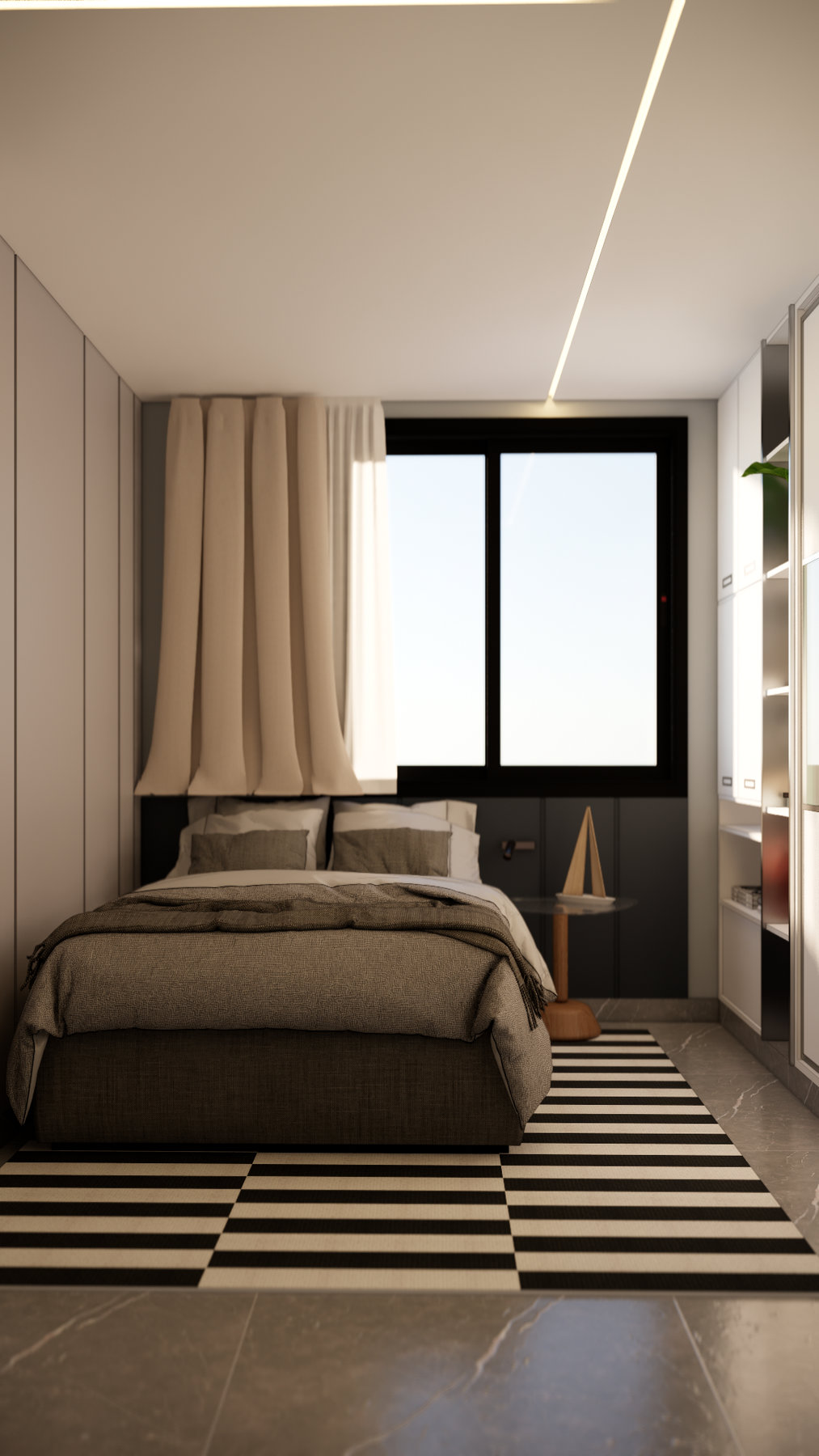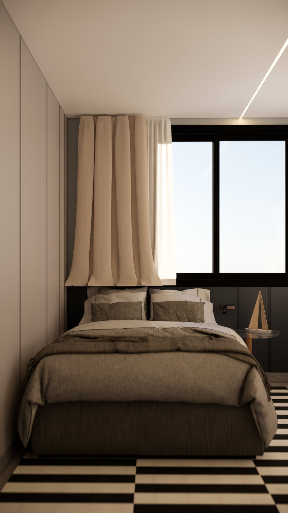 Já na Suite Master, tem-se um oásis pessoal. Apesar de um ambiente majoritariamente masculino, o azul ultramarino junto a tons neutros e os pontos de iluminação indireta, trazem serenidade remetendo intrinsicamente a descanso e espaço pessoal.