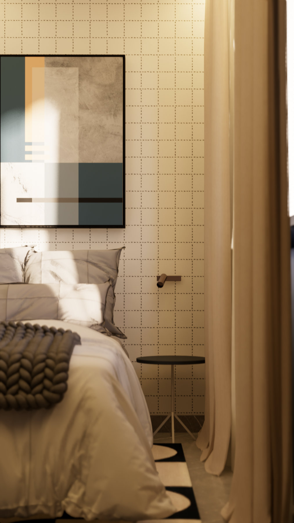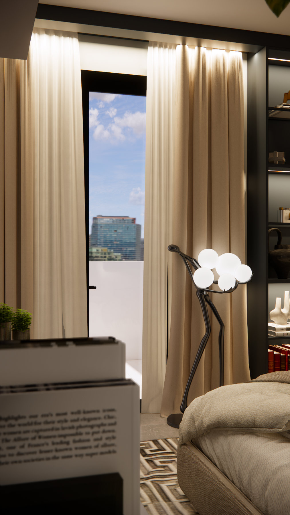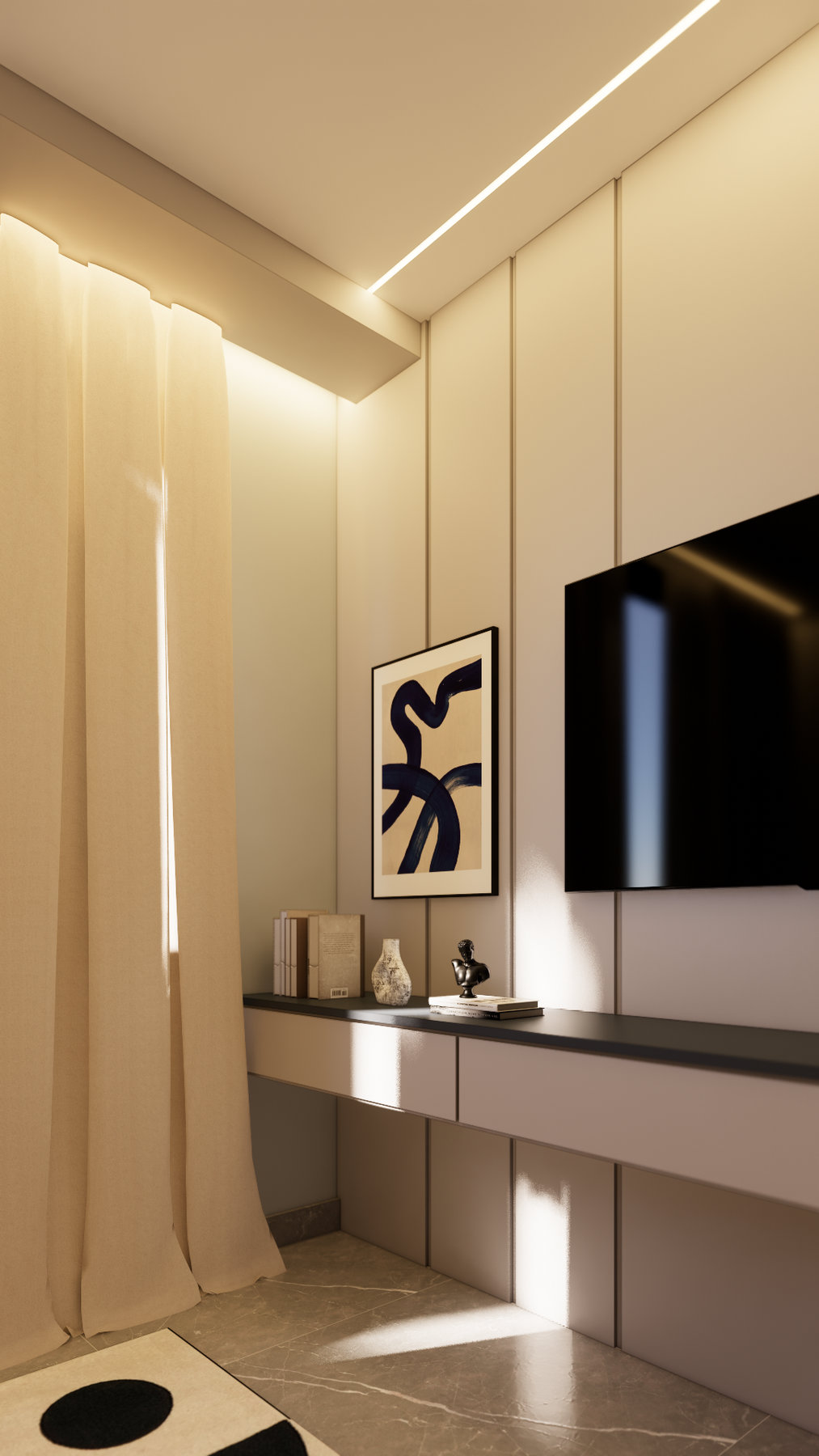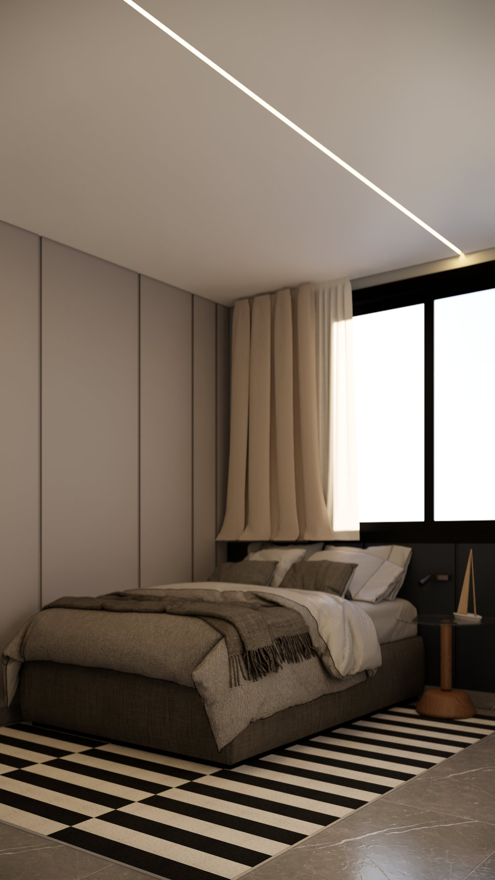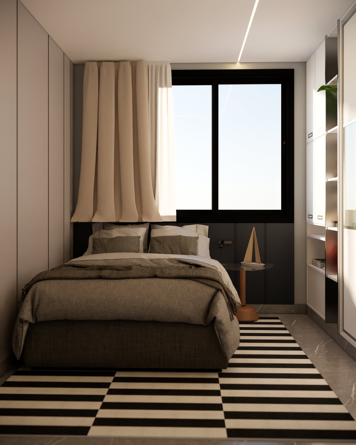 Já na Suite Master, tem-se um oásis pessoal. Apesar de um ambiente majoritariamente masculino, o azul ultramarino junto a tons neutros e os pontos de iluminação indireta, trazem serenidade remetendo intrinsicamente a descanso e espaço pessoal.